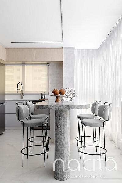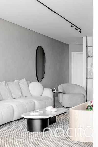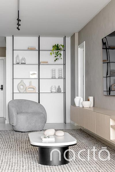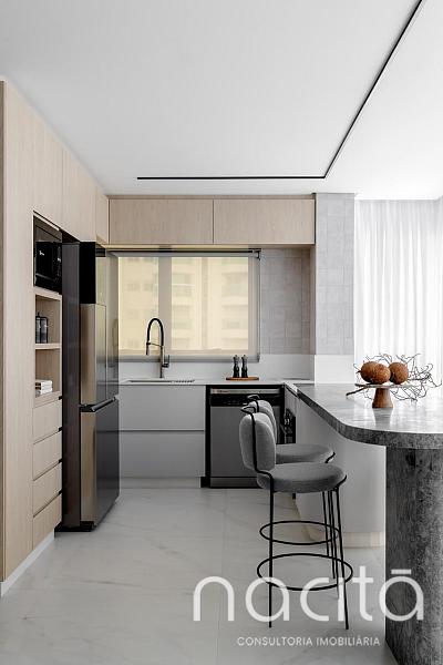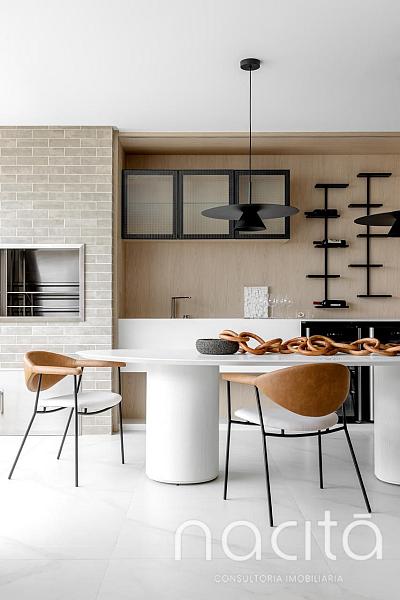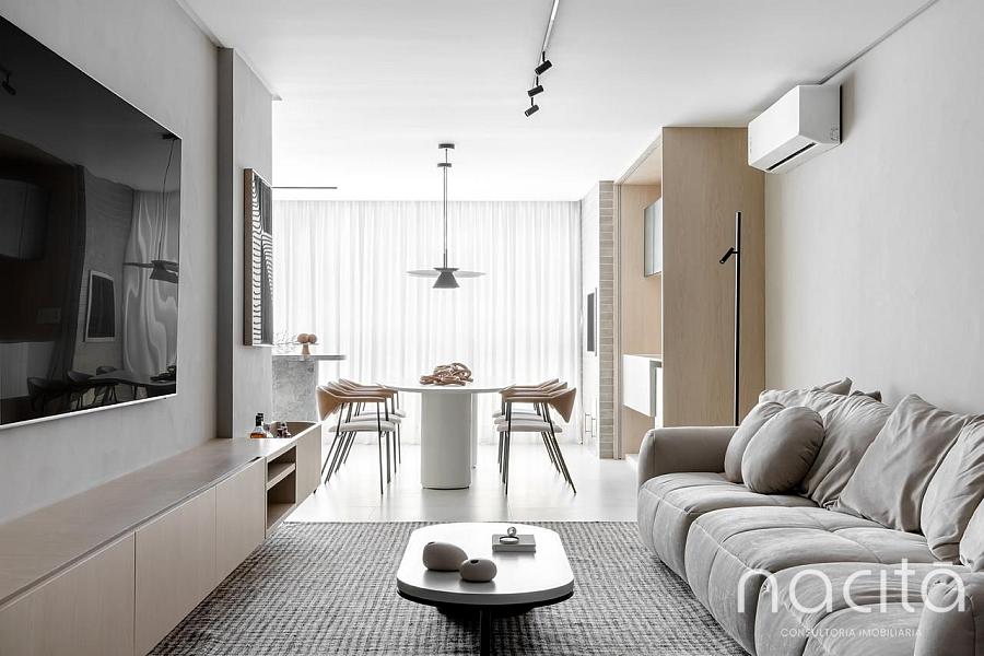 O living é generoso e integrado, proporcionando ambientes agradáveis para receber, com destaque para a vista para o mar, que valoriza ainda mais o imóvel e cria uma experiência única de morar na Praia Brava.
