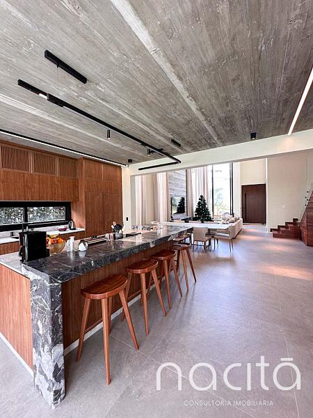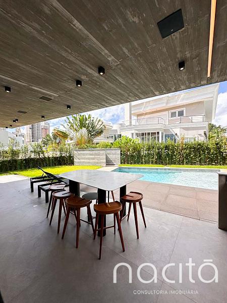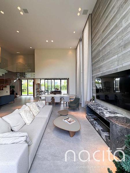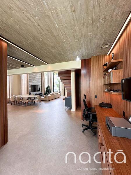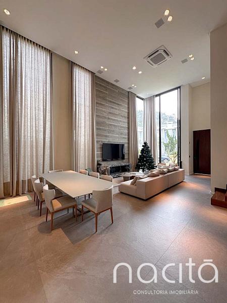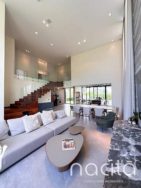Construída em um terreno de 450 m², a residência possui aproximadamente 474 m² de área construída, com pé-direito duplo de 5,84 metros, proporcionando imponência e excelente iluminação natural.